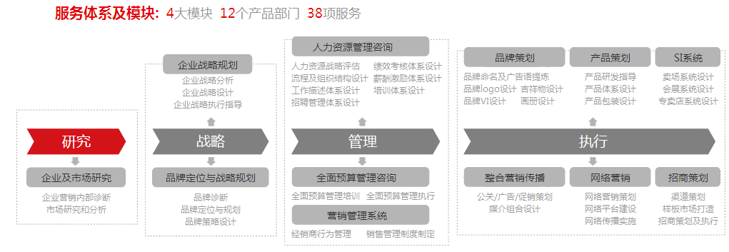 重专业 3大研究中心,13年10万级数据库,100家500强企业跟踪研究,4核12线程品牌系统建设服务。从战略、管理、品牌、 营销多个专业领域建设和维护品牌价值
