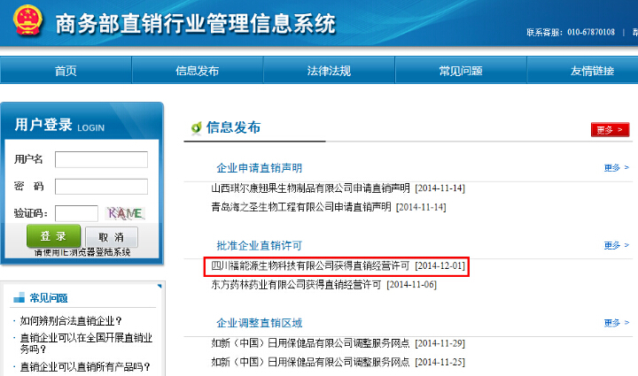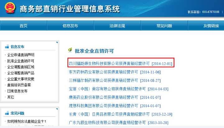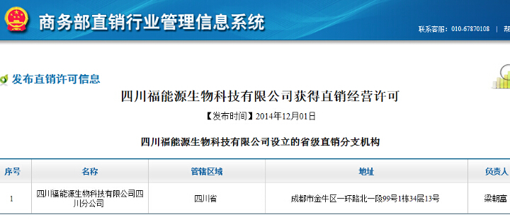 2014年12月1日,在四川省委、省政府的关心下,在各级主管部门的帮助和指导下,四川福能源生物科技有限公司正式获得国家商务部颁发的《中华人民共和国直销经营许可证》,并在国家商务部直销行业管理信息系统对外公布。直销许可证的取得将开启福能源大健康事业又一新的篇章。