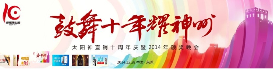 2014年,是太阳神直销十周年。十年来,太阳神直销理想主义的旗帜始终高高飘扬,我们满怀理想与激情地走过了二次创业的第一个阶段,迎来了太阳神事业的新纪元。值此喜庆欢腾之际,公司将倾力打造太阳神直销十周年庆典,为全体太阳神家人奉上一场气势恢宏的饕餮盛宴!